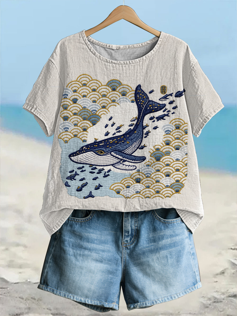 Women's Vintage Ocean Whale Art Linen Short Sleeves T-shirt
