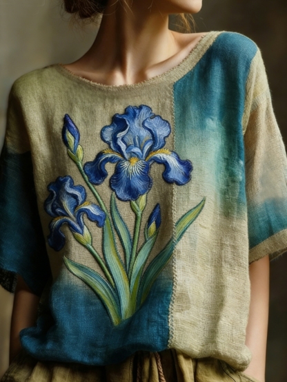 Women's Oil Painting Inspired Irises Embroidered Flowy Linen Casual Shirt