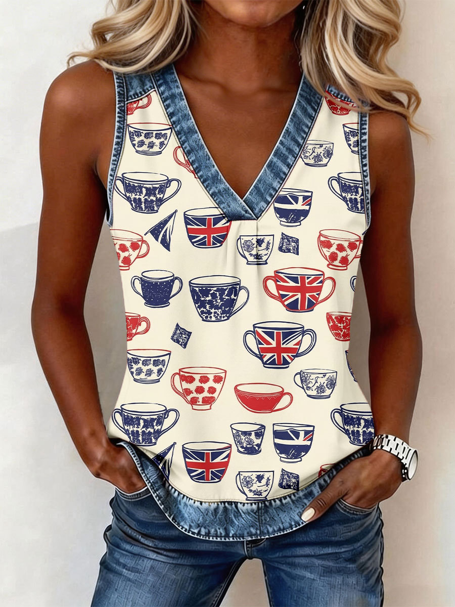 Women's UK Flag Teacup Print V-Neck Tops
