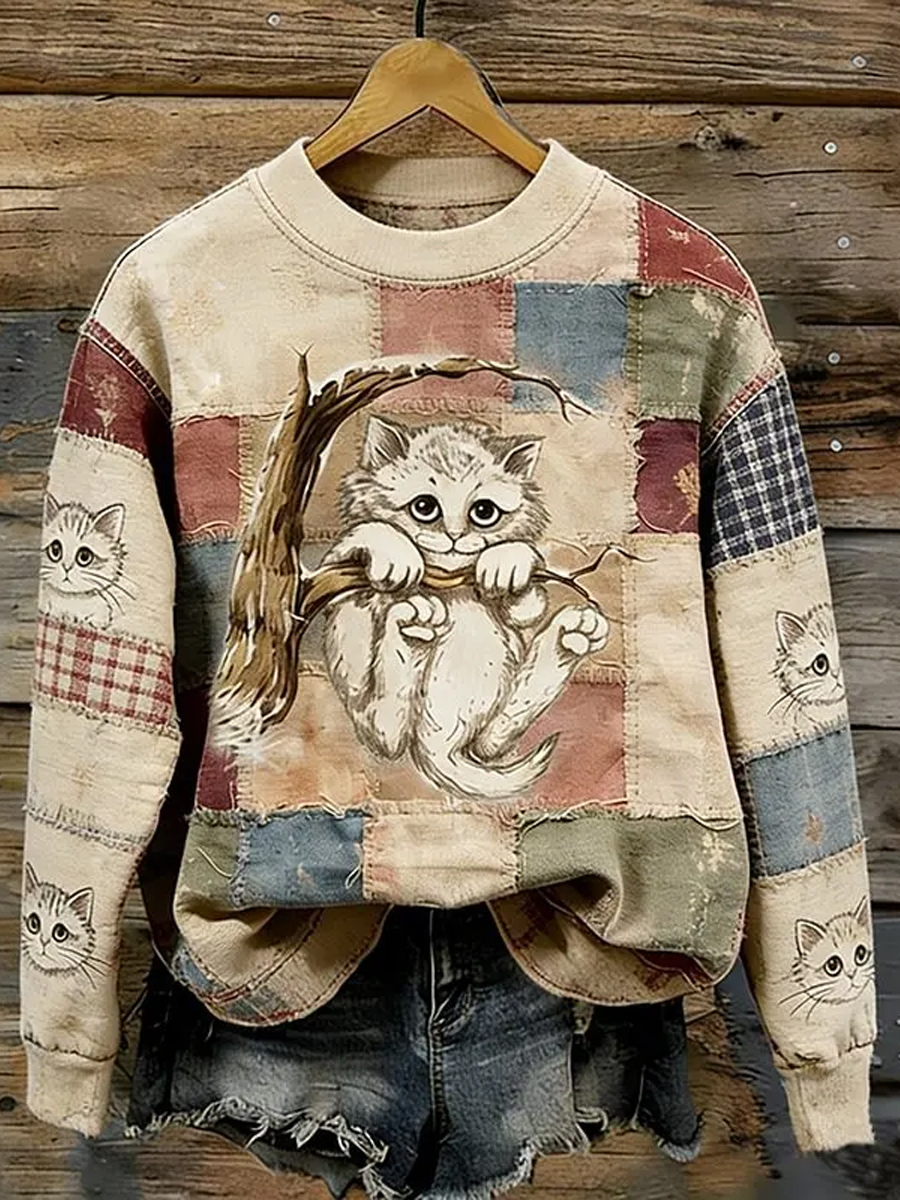 Women's Vintage Opalite Kitten In Tree Distressed Cat In Patchwork Art Cozy Sweatshirt